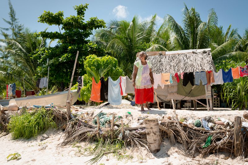 A woman outside of her home in a fishing village near Betio in Kiribati. Photograph: Christian Åslund/Greenpeace