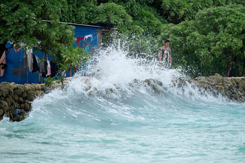 A Pacific Islander observes the waves hitting the sea wall near her home. Photograph: Christian Åslund/Greenpeace