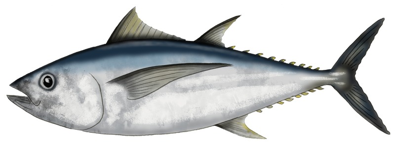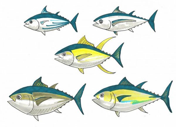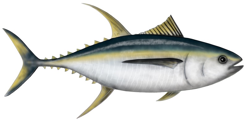 Yellowfin are widespread and magnificently-streamlined fish. And, yes, they have yellow fins, including characteristically sickle-shaped elongated ‘go faster’ ones. They are found around the world, but mostly confined to tropical waters. They can grow to over two metres in length.
