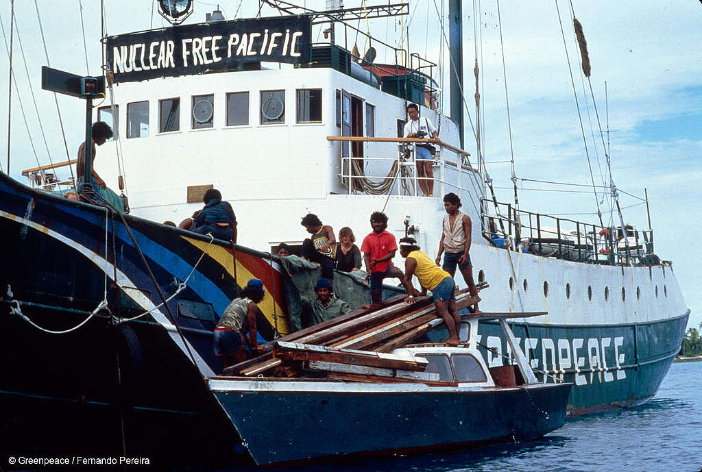 In the eighties, nuclear was Greenpeace’s primary focus, which coincided with the Nuclear Free and Independent Pacific Movement, a strong campaign to have the whole Pacific region declared a nuclear free zone. Between 1946 and 1958, 67 nuclear bombs were detonated on the Marshall Islands, and the people on Rongelap suffered severe health impacts, such as miscarriages, as a result of radioactive fallout.