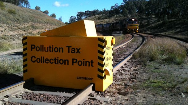 Greenpeace calculated that under a projected carbon price of $26 per tonne, BHP’s Mount Arthur Mine in the Hunter Valley (their largest existing Australian coal operation) would face a piddling carbon tax impost roughly equivalent to only 3 days of operations (<1%). We tried to extract this carbon tax by establishing a ‘carbon tax collection point’ on the rail line leading from the mine.