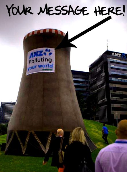 Your message could be on our huge 12m coal power cooling tower situated outside ANZ’s fancy HQ in Melbourne very soon.