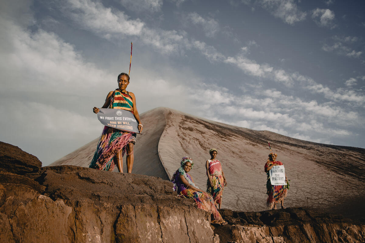 During the opening of the COP26, 200 women gathered at Mt Yasur, an active volcano on the island of Tanna in Vanuatu. The women hold signs, calling for climate justice in the Pacific.