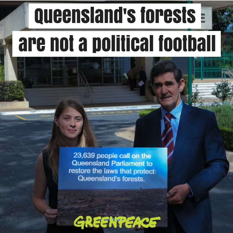 But community support for Queensland’s forests has exploded. In just six days, more than 25,000 of us signed our petition calling on MPs to make the right choice. Our amazing volunteer Maddy delivered your name to the Speaker of the House, Peter Wellington, the morning before MPs debated whether to restore the laws. They know we have a movement of people ready to act for our forests, our climate and our Reef. Share this image on Fcebook (and tag QLD Premier Annastacia Palaszczuk) to show your commitment for Queensland’s forests.