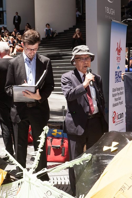 That recalcitrance was highlighted yesterday at a Sydney CBD rally. Outside Commonwealth offices and just across the road from the Japanese Consulate, Nagasaki survivor Terumi Tanaka shared his story urged the governments to give peace a chance and sign the treaty banning nukes.