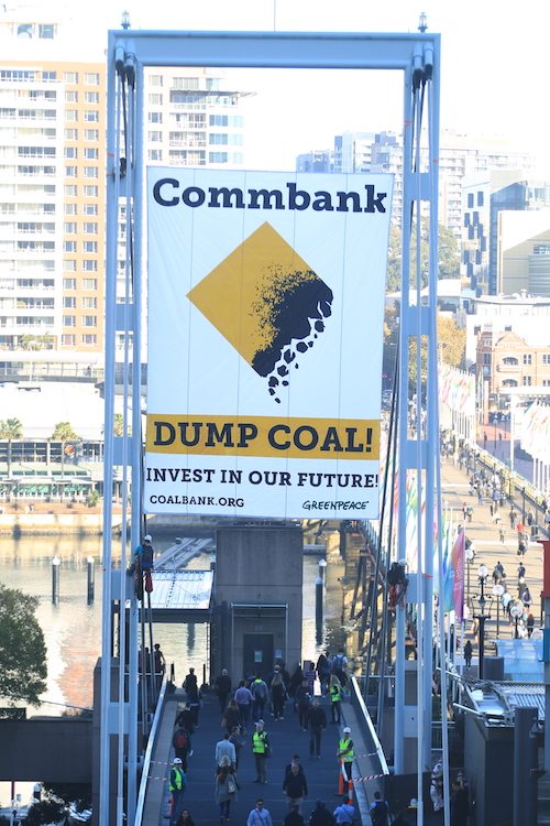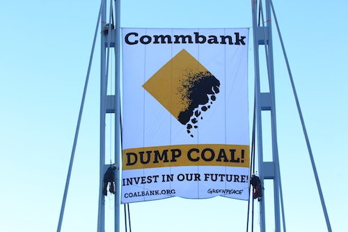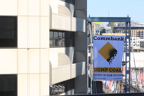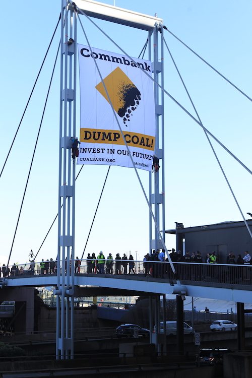 Today, two volunteers scaled a bridge outside the Commonwealth Bank’s headquarters in Sydney to send a message the bank can’t ignore.