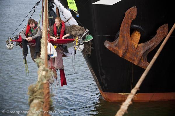 27 June 2012, Netherlands: You won’t get away that quick! Greenpeace activists lock themselves to mooring lines for over six days and block the Margiris from starting its journey to Australia.