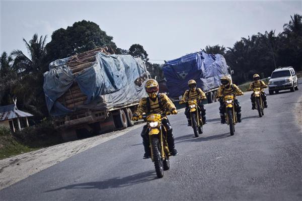 Greenpeace tiger activists encounter a truck carrying logs from a natural forest on the first day of the "tiger tour", where they will travel through Sumatra to bear witness to the real condition of Indonesia's forests. Image: Ulet Ifansasti