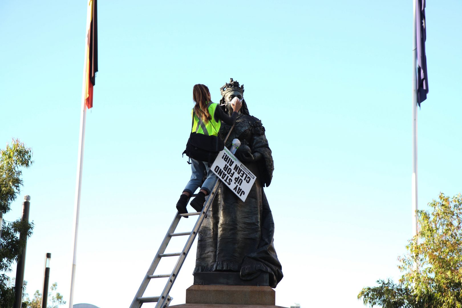 Our all-female team pulled off the dust-masking with aplomb, and we were stoked to have the support of Queen Victoria’s statue herself. She looks across at Weatherill’s office, so there’s no chance they could have missed Vic and her message.