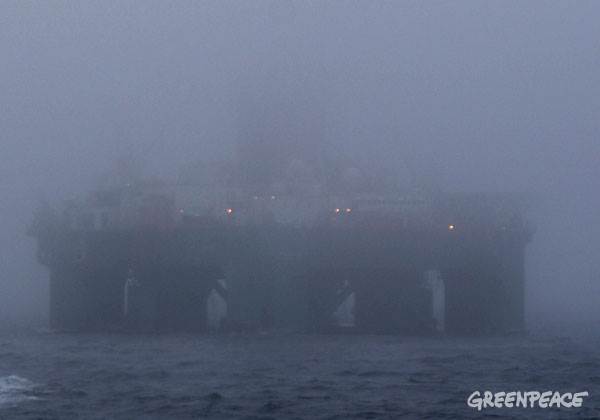Everyone was ready for deployment, sweating in their Arctic clothing. Then suddenly the fog lifted and there was the rig in all it’s monstrous glory. I called for the boat to be launched and, like clockwork the team took Kumi to the rig.