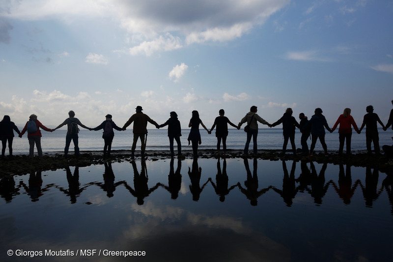 Die Tour informiert ueber den Klimawandel als Fluchtursache. Die Greenpeace-Ausstellung zeigt an sechs Laenderbeispielen die Zusammenhaenge aus Wetterextremen und Fluchtbewegungen auf.|People hold hands on a beach in Molyvos, Lesbos, calling for safe passage and no more deaths. The activity was held in solidarity with other protests across Europe on Saturday February 27 as thousands of people in more than 100 cities marched in support of refugee rights.