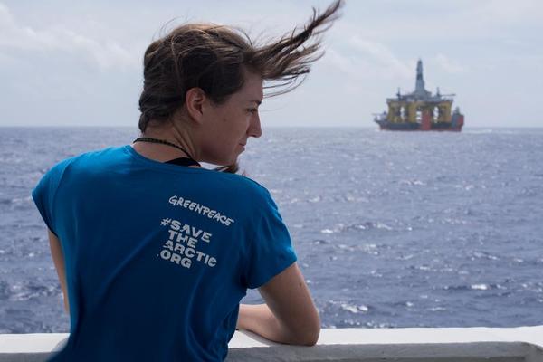 Miriam Friedrich (23), Austria looking at the Shell's oil rig the Polar Pioneer from the bridge of the Esperanza. Six people from around the world are tailing Shell's Arctic oil rig on board the Greenpeace ship Esperanza. As ambassadors of a movement of millions, the six men and women want to expose Shell's reckless plans to drill in the remote Chukchi Sea in the Alaskan Arctic this summer. Esperanza is following Shell's oil rig the Polar Pioneer in transit across the Pacific on board the heavy lift vessel Blue Marlin.