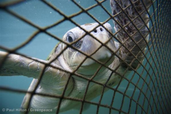 Loggerhead turtle caught in the net of the Ecuadorean purse seiner ‘Ingalapagos’, which was documented fishing on a fish aggregation device (FAD) by Greenpeace in the vicinity of the northern Galapagos Islands. Unknown number of endangered marine turtles die in purse seine FAD fisheries each year. Greenpeace is calling for a total ban on the use of fish aggregation devices in purse seining, and the establishment of a global network of marine reserves.