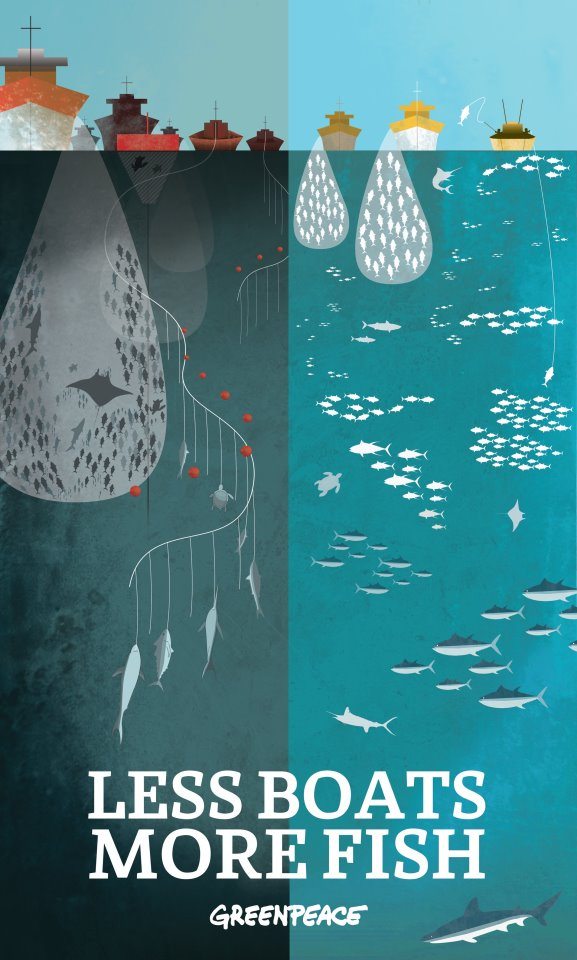 The former requires a plan, but it’s not rocket science. We’ve got an estimated 2.5 times over-sized fishing fleet, so more than half must go. How do you decide who goes? If it’s broken the law (and we’ve documented a fair few that have) – it goes. If it’s using a fishing method that leaves swathes of destruction or tonnes of bycatch in its wake – it goes. And if it’s so big that no stretch of ocean can sustain its hunger for fish – it goes. Goodbye driftnets, goodbye bottom trawling, goodbye fish aggregation devices and industrial super-trawlers, goodbye pirates. Hello pole and line fishing boats, FAD-free tuna seiners, hello local fishers taking their catch with sustainable gear. Welcome back, fish.