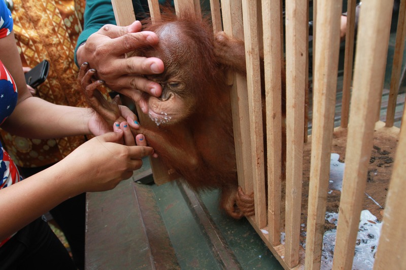 The orangutan is now under the custody of the Conservation and Natural Resources (BKSDA)., Ayu memasukkan Otan, individu orangutan (Pongo Pygmaeus) berumur sekitar 7 bulan, kedalam kandang untuk di rescue dari Desa Lingga, Kecamatan Sungai Ambawang Kabupaten Kubu Raya, Kalimantan Barat, Jumat (18/9/2015). Warga menemukan Otan sedang meminum air sungai di kawasan perkebunan sawit, saat diberi makan Otan tak mau juga pergi dan akhirnya dibawa warga. Otan akhinya dievakuasi Balai Konservasi Dan Sumber Daya Alam (BKSDA) Kalbar dan akan direhabilitasi, Ayu memasukkan Otan, individu orangutan (Pongo Pygmaeus) berumur sekitar 7 bulan, kedalam kandang untuk di rescue dari Desa Lingga, Kecamatan Sungai Ambawang Kabupaten Kubu Raya, Kalimantan Barat, Jumat (18/9/2015). Warga menemukan Otan sedang meminum air sungai di kawasan perkebunan sawit, saat diberi makan Otan tak mau juga pergi dan akhirnya dibawa warga. Otan akhinya dievakuasi Balai Konservasi Dan Sumber Daya Alam (BKSDA) Kalbar dan akan direhabilitasi|Residents rescue a 7 month old orangutan (Pongo pygmaeus) from forest fires, while he was drinking water from the river in an oil palm plantation near the village of Linga, Sungai Ambawang Kubu Raya, West Kalimantan.