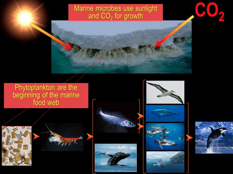 The Southern Ocean which extends down and around Antarctica performs a particularly important role in sequestering carbon dioxide. Tiny phytoplankton can actually be seen living in their homes in sea ice (see the brown layer in the cross section of sea ice in the photograph below).