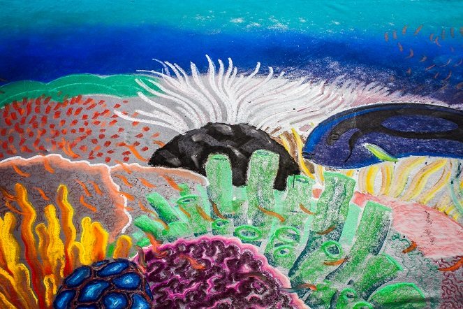 Chalk artist Anton Pulvirenti’s rendering of the bleaching of the Great Barrier Reef in Steyne Park, Double Bay. Sydney.