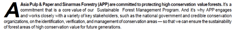But this hasn’t stopped APP from repeatedly making this same claim. Just last year Aida Greenbury, who led at the Jakarta press conference today, stated that ‘any land which is to be converted must not contain High Value Conservation Forest (HVCF)’.
