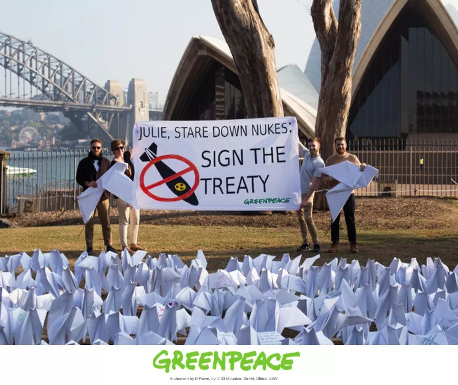 At 7am this morning, 149 origami peace doves carrying thousands of messages for peace took flight in front of the Sydney Opera House. Here’s what it looked like: Over the past month, thousands of us have spoken up for a peaceful world without nuclear weapons – even though our government hasn’t. Julie Bishop had a chance…